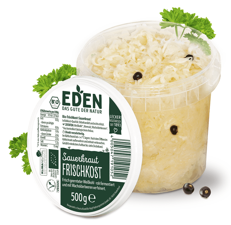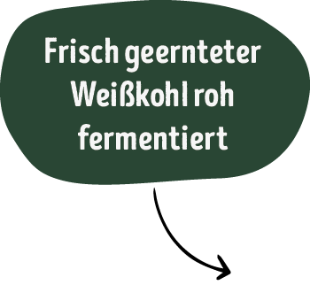 Frisch geernteter Bio-Weißkohl wird in der Sauerkrautsaison jede Woche feldfrisch eingeschnitten, roh fermentiert und mit Wacholderbeeren verfeinert.
